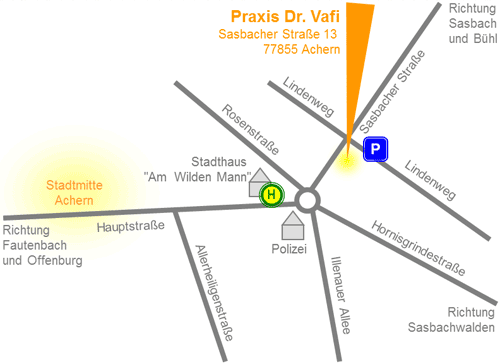 Die nächste Haltestelle ist beim "Stadthaus Am Wilden Mann" an der Hauptstraße, Ecke Rosenstraße. Von dort sind es nur wenige Meter zu Fuß bis zu meiner Praxis.